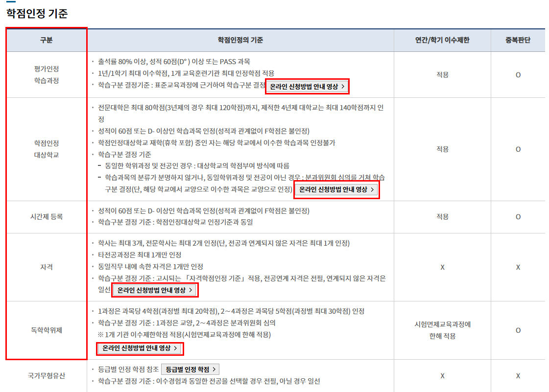 학점은행제 학점인정 신청은 총 6개로 분류되며